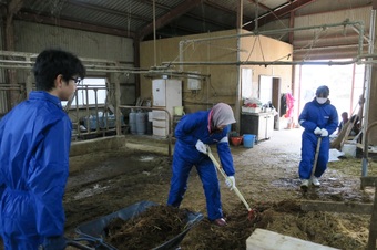 休憩しつつ一生懸命学生が取り組んだ結果、牛舎は見違えるほどきれいになりました。運び出した牛糞は堆肥として、牛が食べるイタリアンダイグラスの畑に撒くそうです。
