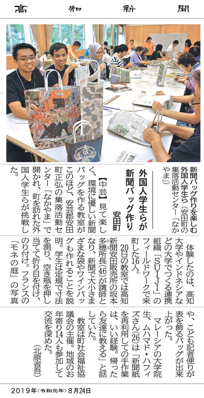 高知新聞「外国人学生らが新聞バッグ作り 安田町」(2019年8月24日)(その他:1.15MB)