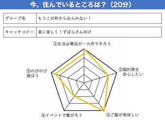 2つのチームに共通していたのは、地域との「つながり」を大切にしたいという意見でした。祭りやイベントだけではなく、学びや趣味等で新しい出会いがある町。ネットだけではなく、同じ町に住む人々が「つながり」を持てるような町のイメージが浮かび上がってきました。