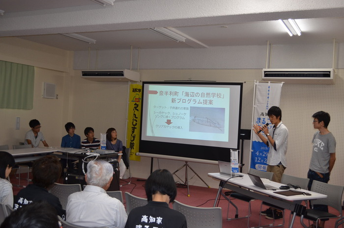 グループプレゼンでは、奈半利町の海辺の自然学校の新プログラムとしてシーカヤックの導入を他県の事例や収益の試算をもとに提案した他、野根山街道でのトレッキングなど実際に参加した経験を踏まえ提案しました。