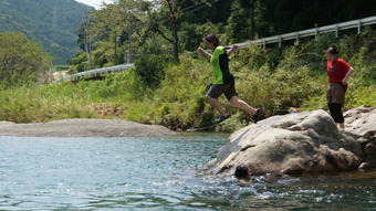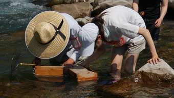 午前中は、レクチャーと「川遊び」です。集落活動センターの取り組みや安田川について住民からレクチャーを受けました。安田川にはダムがないこと、生物や漁法など地域のことをしっかり学んで川へ!鮎の友釣りや川エビ採りなど、住民からマンツーマンで指導を受けました。はじめは足しか水に浸けていなかった学生も、最後は川にジャンプ。あっという間に2時間が経過しました。