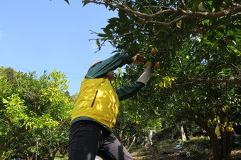 今回の農業体験はゆずの収穫をさせて頂きました。山の斜面に広がる木々には多くのゆずが実り、新鮮なゆずの香りが広がっていました。ゆずの木には固く鋭い棘があるということでご協力いただいた株式会社大豊ゆとりファームの方がご用意して下さったヘルメットと手袋を装着し、収穫の方法についてレクチャーを受けました。