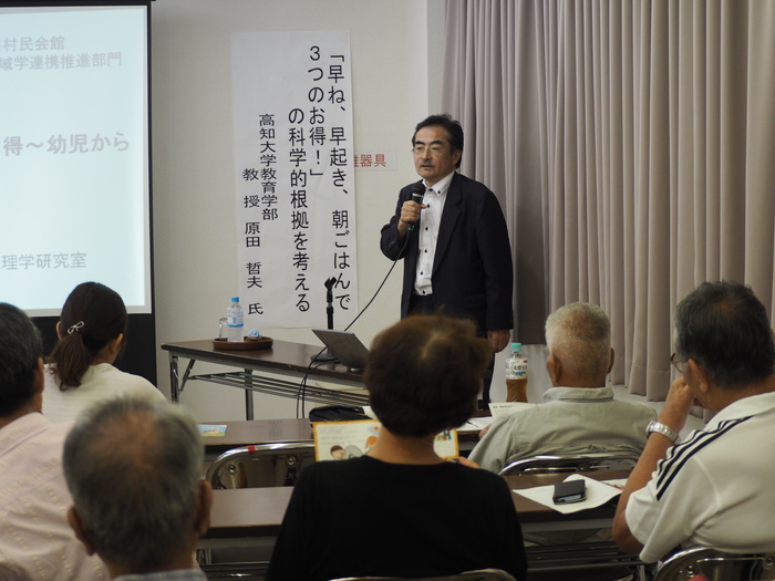 その後、第1回講座「「早ね、早起き、朝ごはんで3つのお得!」の科学的根拠を考える」と題し、高知大学教育学部教授の原田哲夫先生による講座が行われました。